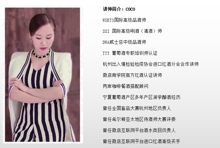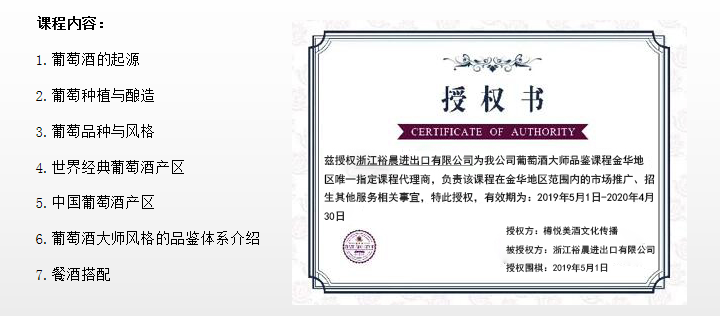 該課程針對(duì)葡萄酒從業(yè)者與愛好者,通過葡萄酒的歷史,種植與釀造等知識(shí),系統(tǒng)的學(xué)習(xí)葡萄酒,尤其是葡萄酒大師風(fēng)格的品鑒體系。本課程在引進(jìn)過程中,加入了中國(guó)葡萄酒產(chǎn)區(qū)的內(nèi)容。Robert Geddes MW在中國(guó)產(chǎn)區(qū)進(jìn)行了多年的實(shí)地考察,從一位葡萄酒大師的角度,對(duì)中國(guó)葡萄酒產(chǎn)區(qū)進(jìn)行描述。Robert Geddes MW在葡萄酒行業(yè)工作了數(shù)十年,經(jīng)歷了數(shù)個(gè)新興葡萄酒國(guó)家從無到有的歷程,他希望接下來可以見證中國(guó)葡萄酒行業(yè)在世界上的崛起,因此在金華成立了培訓(xùn)考點(diǎn),致力于葡萄酒文化的對(duì)內(nèi)對(duì)外的引進(jìn)與輸出-引進(jìn)國(guó)外的原汁原味的葡萄酒文化到中國(guó),同時(shí)將中國(guó)的葡萄酒產(chǎn)區(qū)推向國(guó)際。三級(jí)品酒大師COC0接下來大部分的時(shí)間將常駐金華,教大家葡萄酒大師初級(jí)品酒師的培訓(xùn)與咨格證書的審批和發(fā)放。